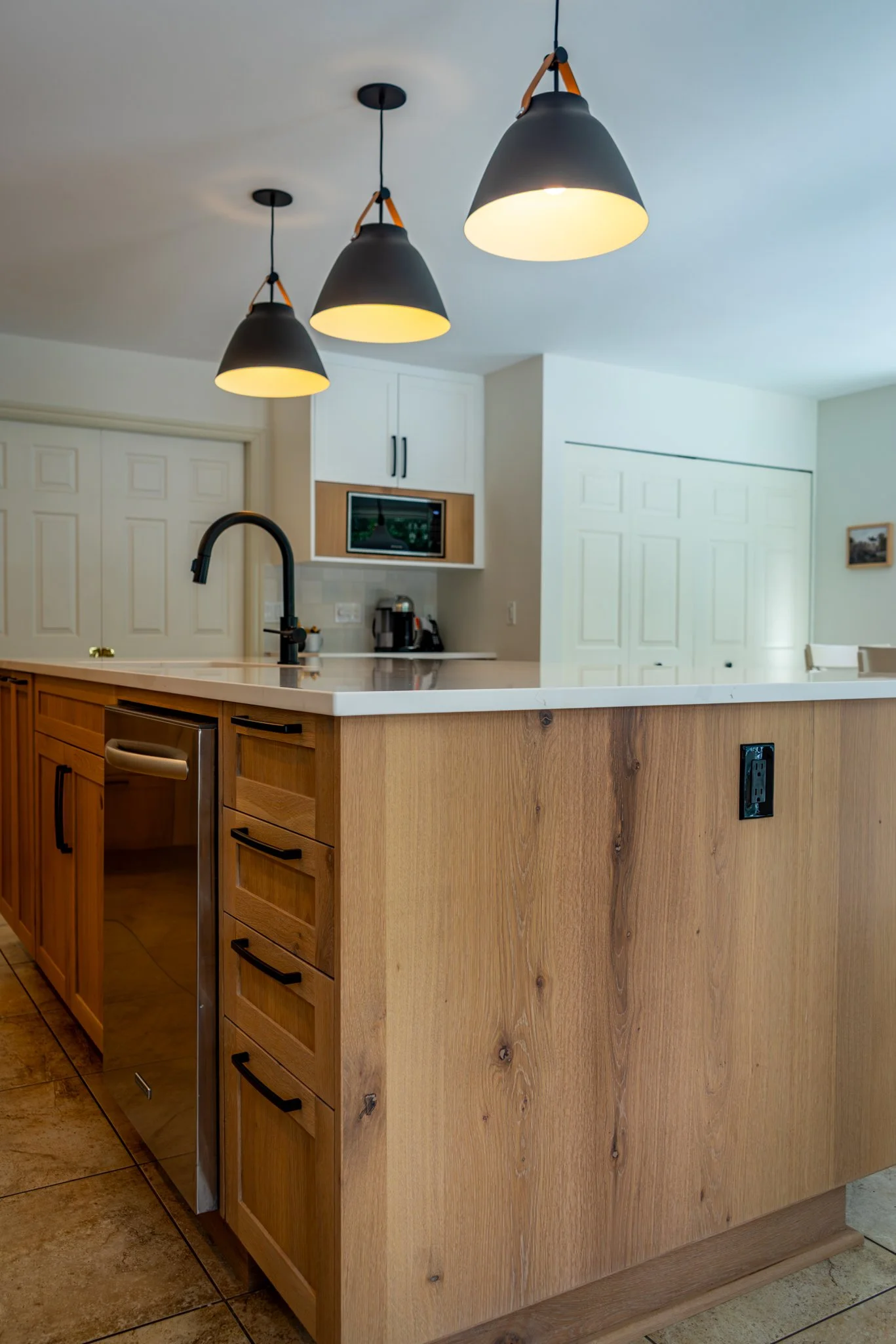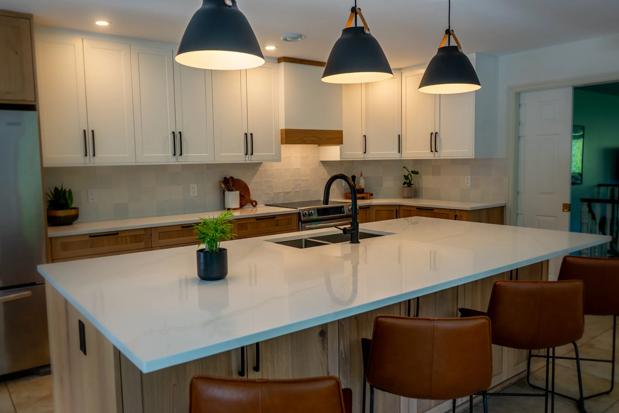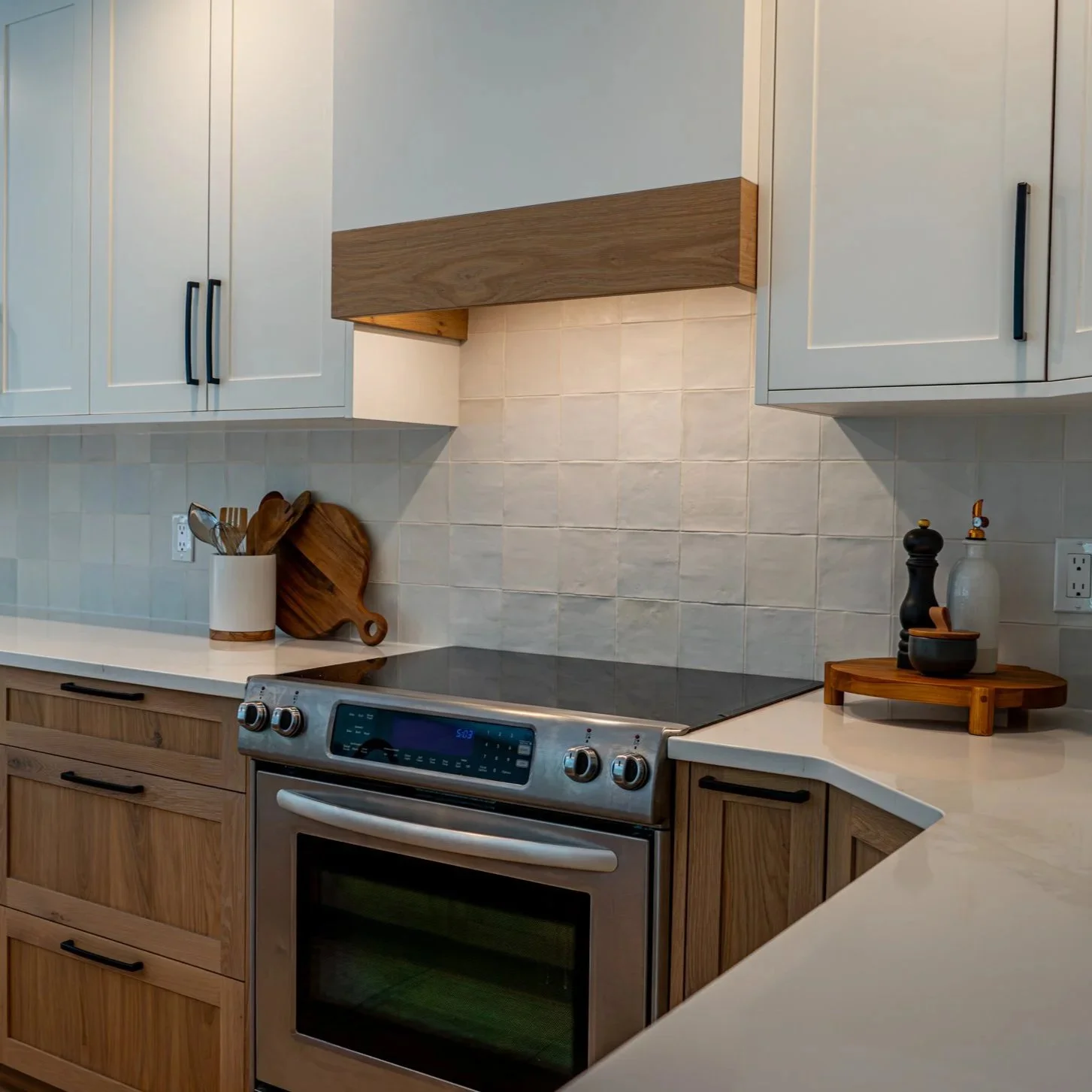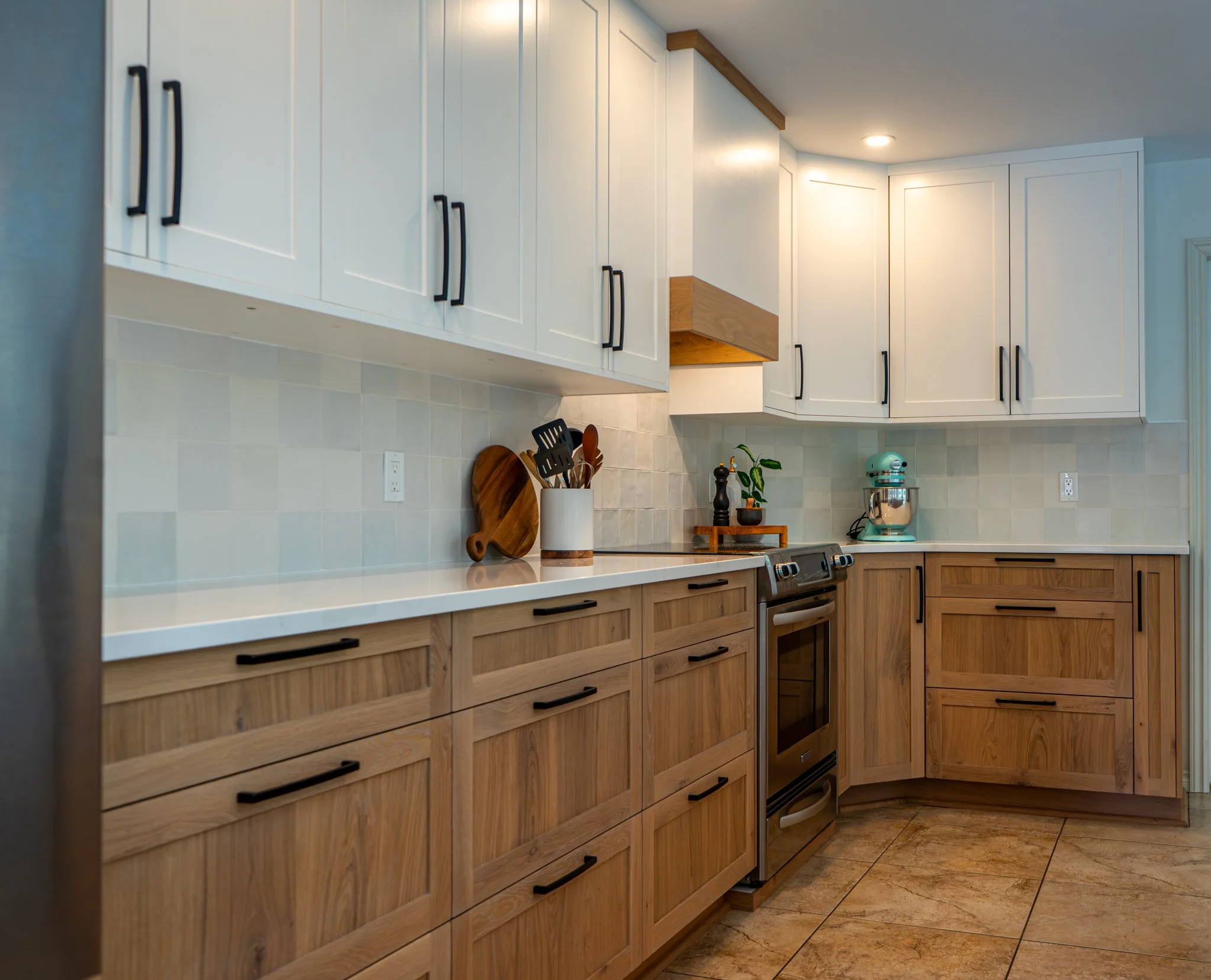 This classic shaker-style kitchen pairs warm white oak lower cabinets with brilliant white uppers for a look that feels both fresh and timeless. A simple narrow crown and clean gable panels frame the cabinetry, bringing traditional craftsmanship into the modern era. The mix of rich wood grain, smooth marble countertops, and raw tile backsplash adds depth, texture, and visual intrigue.
